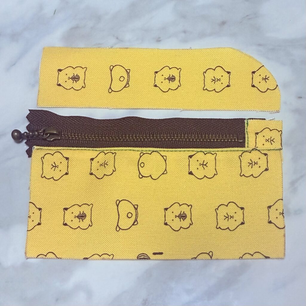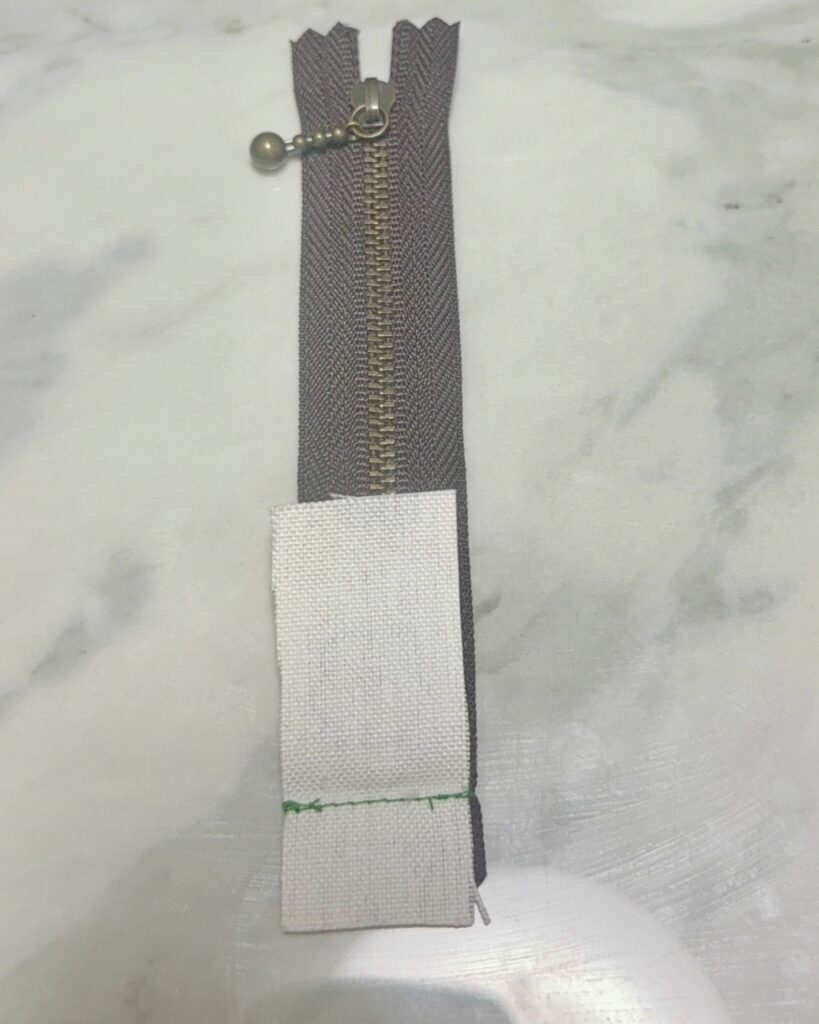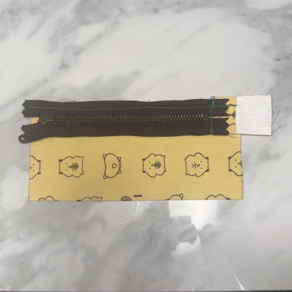 1. 12cmファスナーに同一幅の布を付け、ファスナー端の長さを延長します。