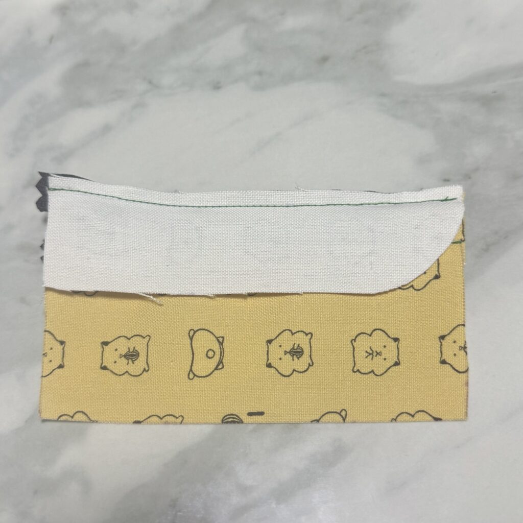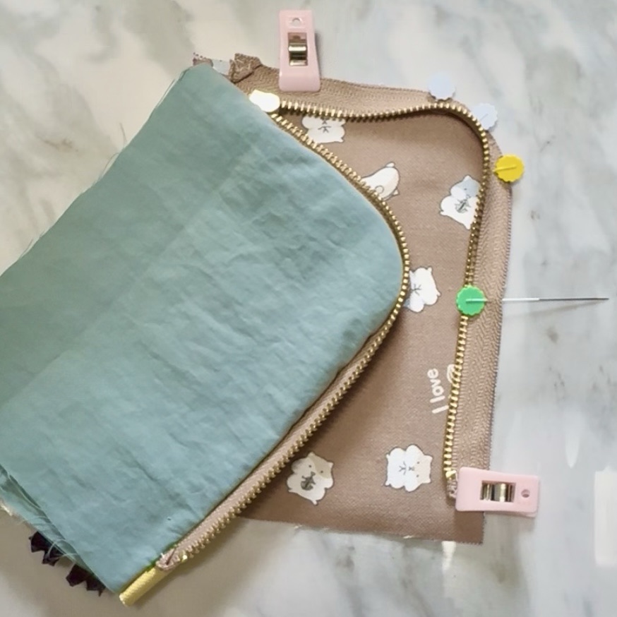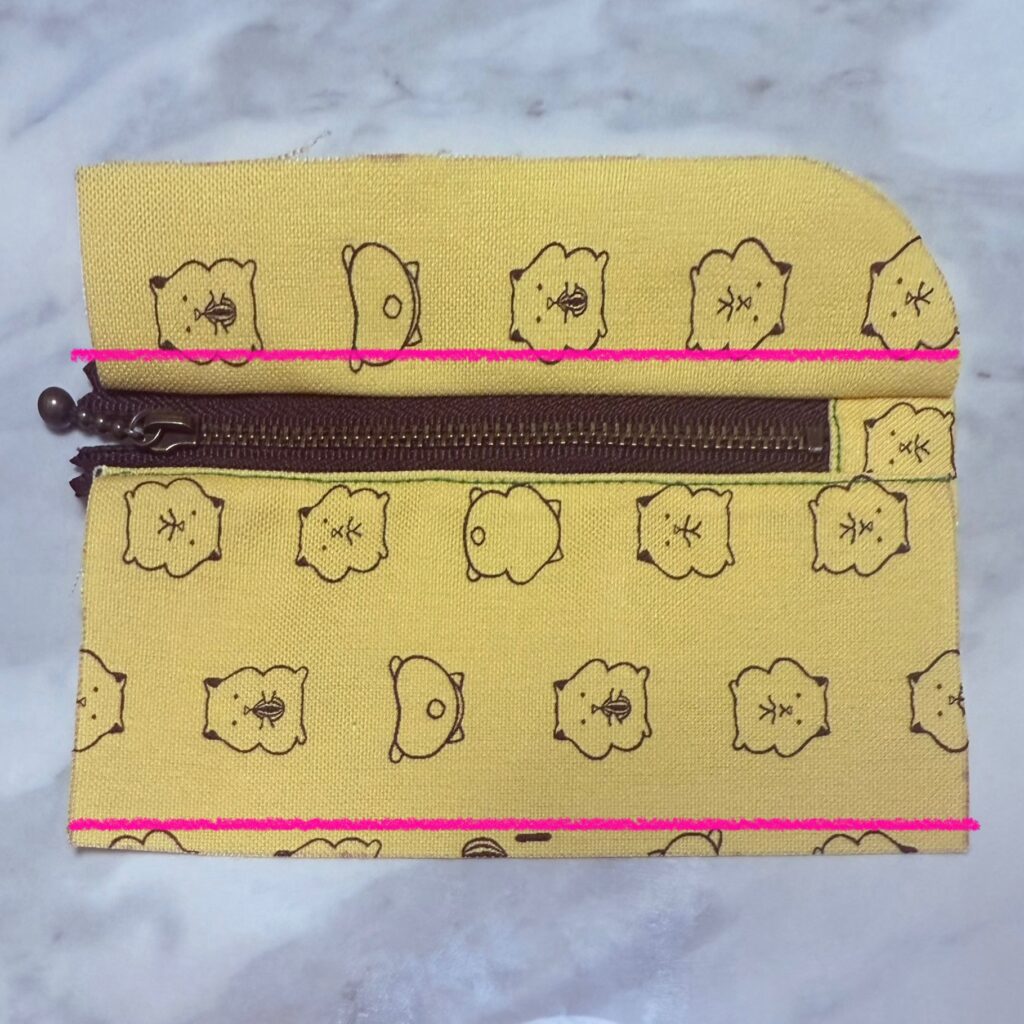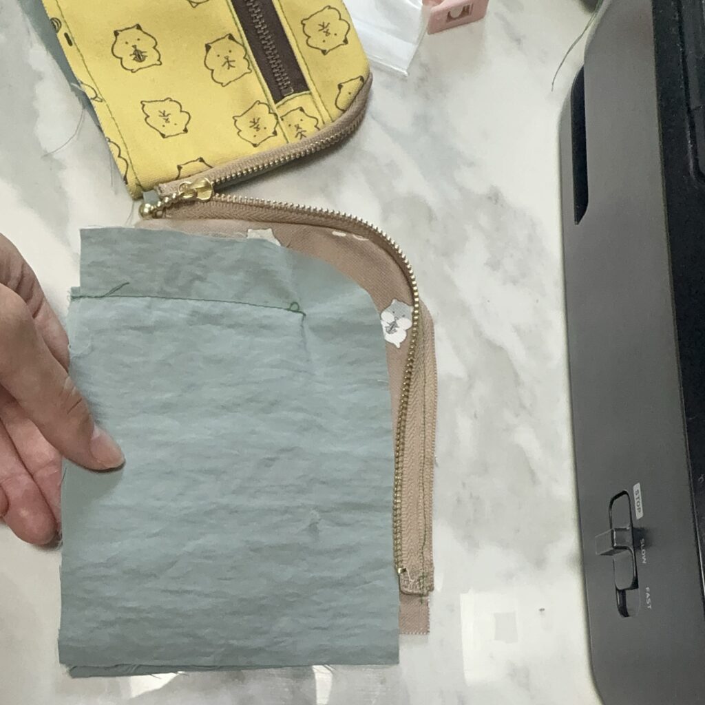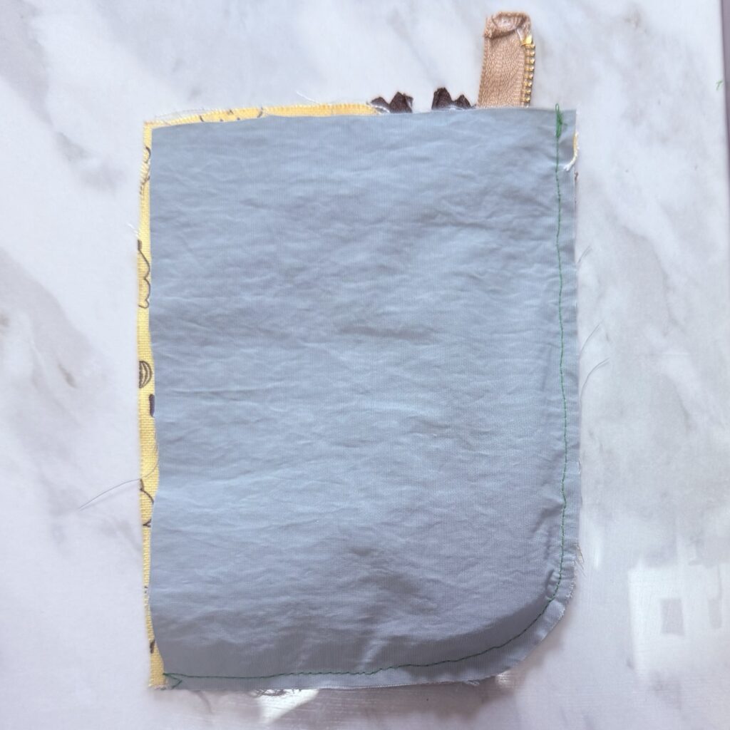 7. 裏地の生地のファスナー側の端は、メインポケット用のファスナー取り付け時に縫いやすくするために切っておいても良いです。
