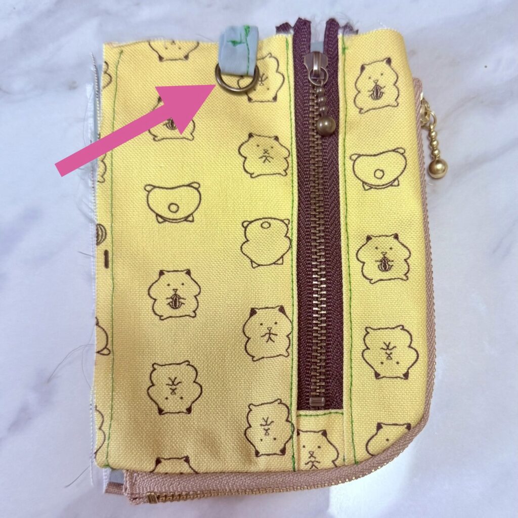 13. 外ポケットがある表地にDカンを仮縫いしておきます。